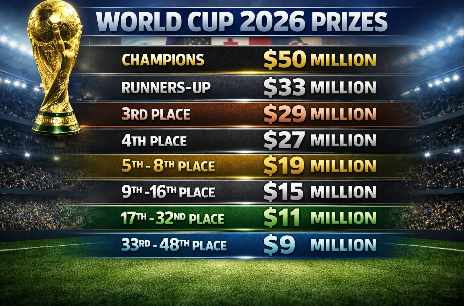 البطل 50 مليون دولار الوصيف 33 مليون دولار المركز الثالث 29 مليون دولار المركز الرابع 27 مليون دولار المراكز من 5 إلى 8 19 مليون دولار المراكز من 9 إلى 16 15 مليون دولار المراكز من 17 إلى 32 11 مليون دولار المراكز من 33 إلى 48 9 ملايين دولار